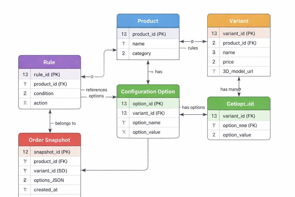 • Model danych powinien uwzględniać warianty, zależności, reguły cenowe i wersjonowanie.
