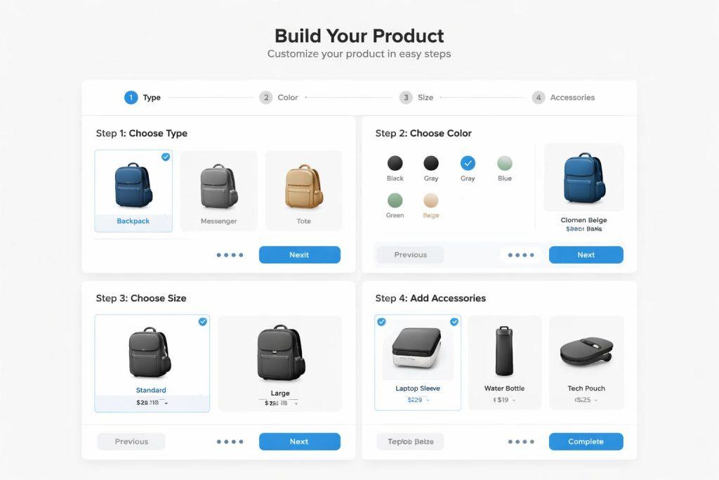 Konfigurator wielu wariantów projektuj od modelu danych i reguł biznesowych, a dopiero potem od interfejsu. Najpierw ustal atrybuty, zależności, wyjątki, wpływ na cenę i dostępność, a następnie zbuduj UX, który prowadzi użytkownika krok po kroku i blokuje błędne kombinacje w czasie rzeczywistym.
