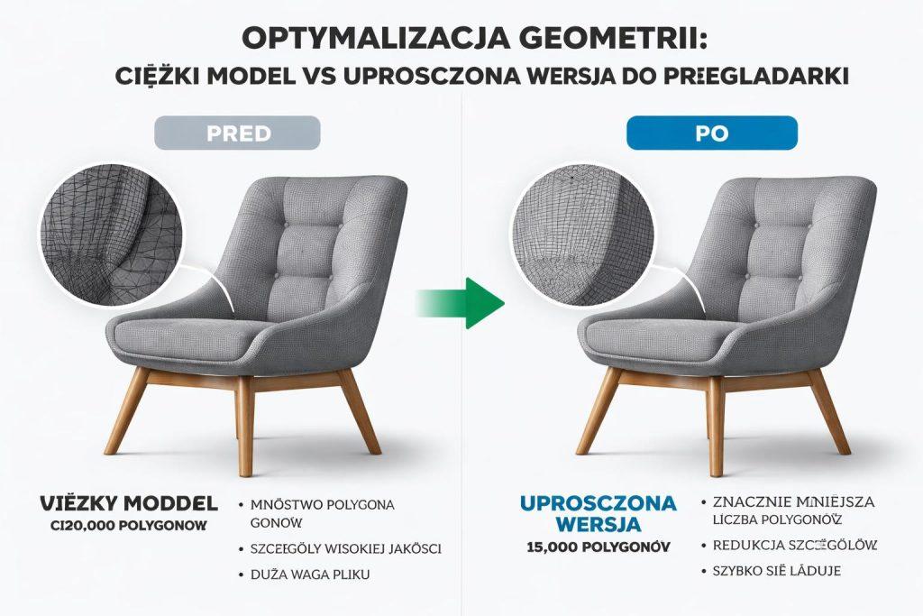 Optymalizacja geometrii polega na świadomym uproszczeniu bryły. Warto usuwać niewidoczne powierzchnie, scalać drobne elementy, ograniczać liczbę powtarzalnych detali i zostawiać tylko tyle szczegółu, ile rzeczywiście widać w docelowym widoku produktu.