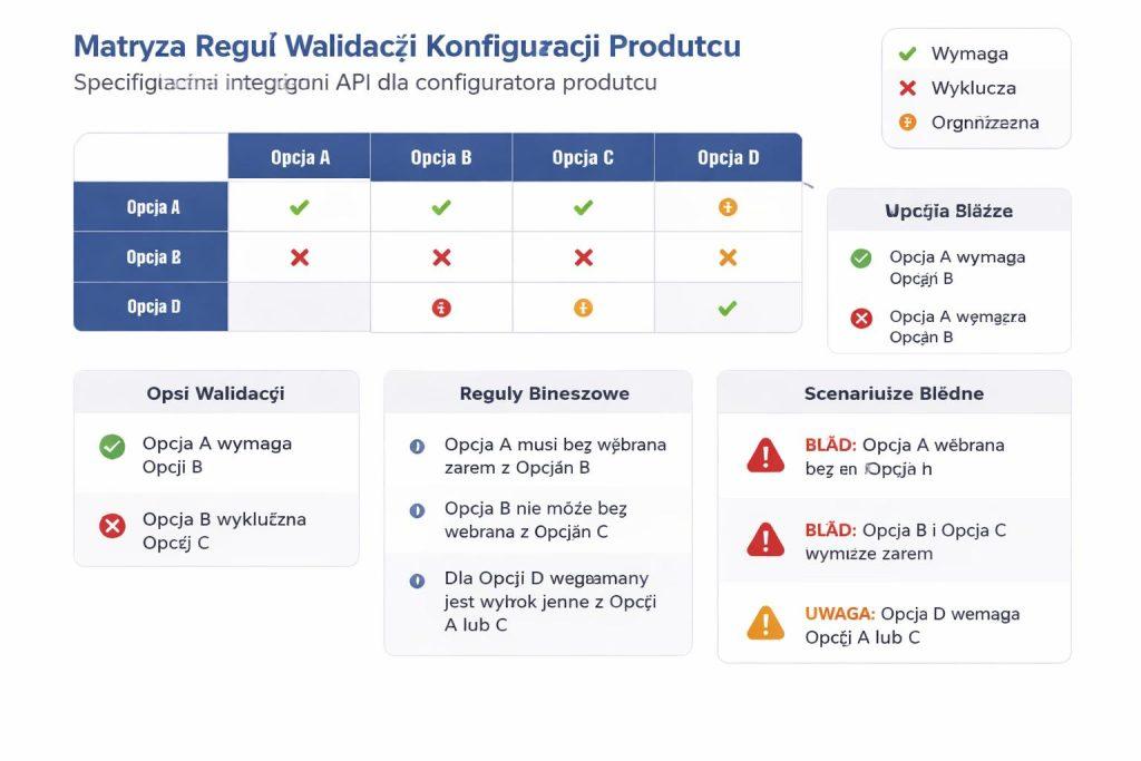 Walidacja w konfiguratorze nie kończy się na poprawności formatu. Trzeba jeszcze sprawdzić, czy dana kombinacja ma sens biznesowy. Dlatego specyfikacja powinna rozdzielać walidację składniową od walidacji regułowej. Pierwsza sprawdza typy danych, obecność pól i format. Druga odpowiada za kompatybilność opcji, dostępność, limity i zależności między wariantami.