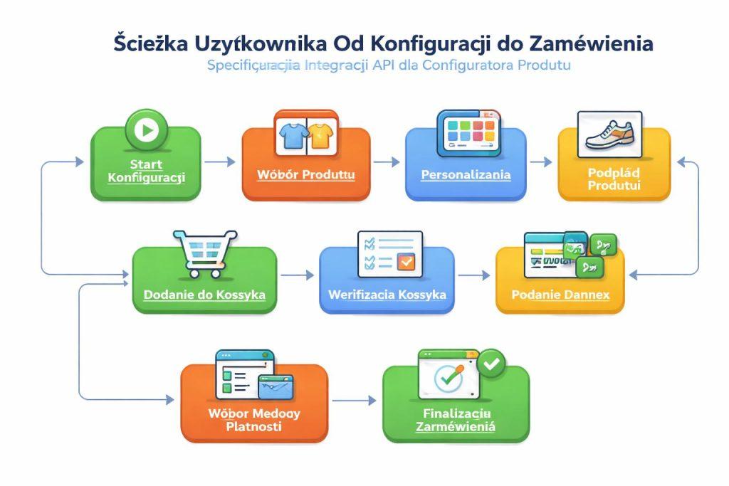 Sama lista endpointów nie wystarczy. Specyfikacja powinna opisywać rzeczywisty przebieg użytkownika: wejście na kartę produktu, wybór wariantu bazowego, dynamiczną aktualizację ceny, dołożenie akcesoriów, walidację dostępności, zapis konfiguracji i przekazanie jej do koszyka lub oferty PDF. Tylko wtedy widać, czy API wspiera sprzedaż, a nie jedynie strukturę danych.