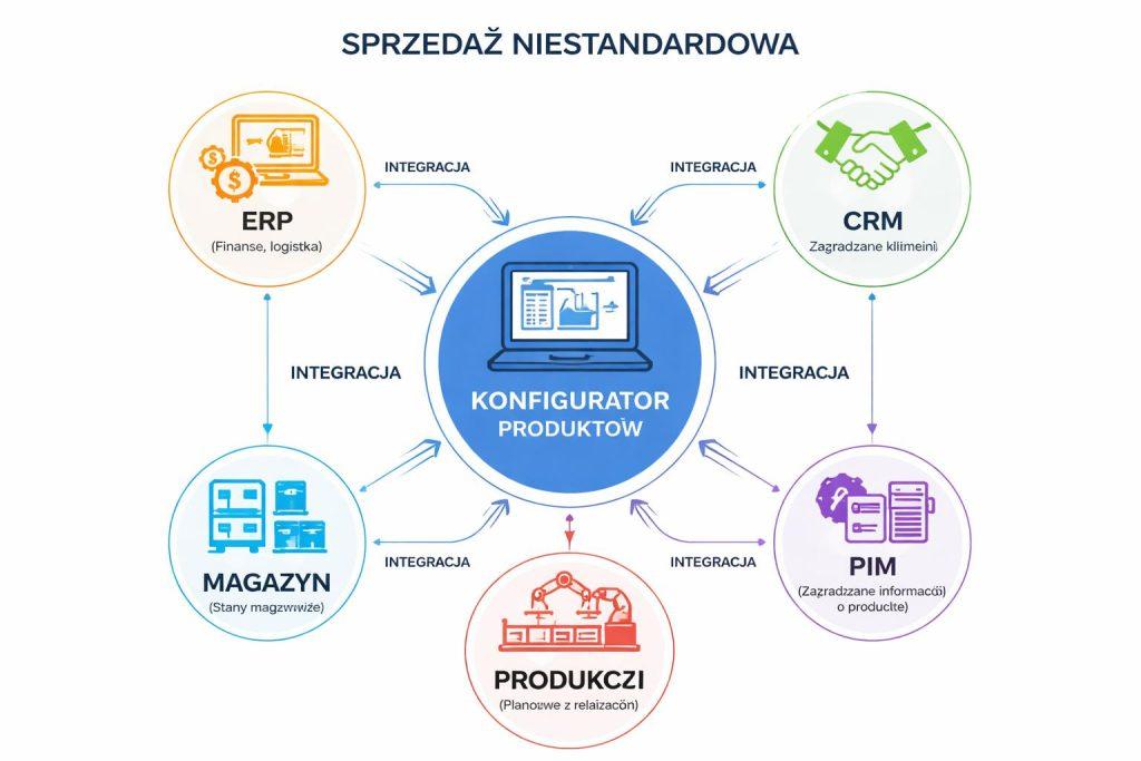 Konfigurator dla sprzedaży niestandardowej rzadko działa jako samodzielny moduł. Najczęściej musi pobierać dane produktowe, sprawdzać dostępność, przekazywać konfigurację do systemu ofertowego albo do produkcji.
