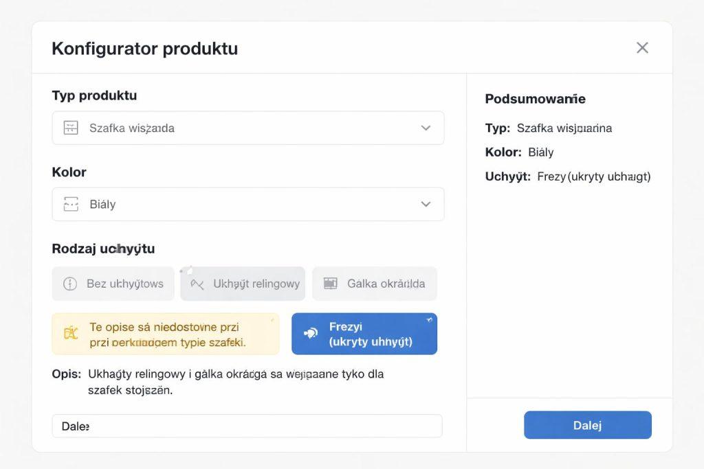 Przy produktach niestandardowych sama lista opcji nie wystarczy, bo wybory wpływają na siebie nawzajem. Wybrany materiał może ograniczać rozmiary, konstrukcja może blokować część dodatków, a technologia produkcji może wpływać na czas realizacji.