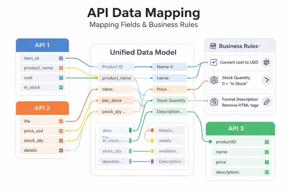 - Zdefiniuj mapowanie pól dla każdego źródła API.