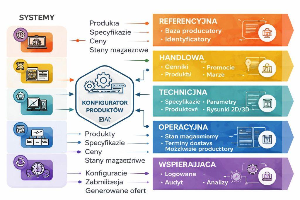Najczęściej integruje się ERP, PIM, systemy magazynowe, bazy cenników, CRM, katalogi dostawców oraz systemy wyceny i obsługi zamówień. W większych wdrożeniach dane pochodzą z kilku źródeł jednocześnie.