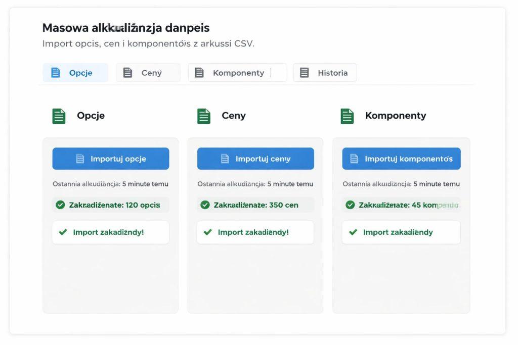 W wielu firmach największym problemem nie jest sam konfigurator, ale utrzymanie danych. Gdy rośnie liczba opcji, cen, komponentów i wyjątków, ręczna edycja w panelu staje się zbyt wolna i podatna na błędy.