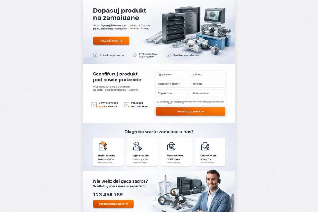 Przy konfiguratorach produktów B2B szczególnie dobrze działają sekcje z informacją o integracji z systemami, generowaniu zapytań ofertowych, obsłudze niestandardowych wariantów czy przekazywaniu danych do CRM. Jeśli konfigurator ma wspierać sprzedaż złożoną, landing page powinien to sygnalizować już na wejściu.